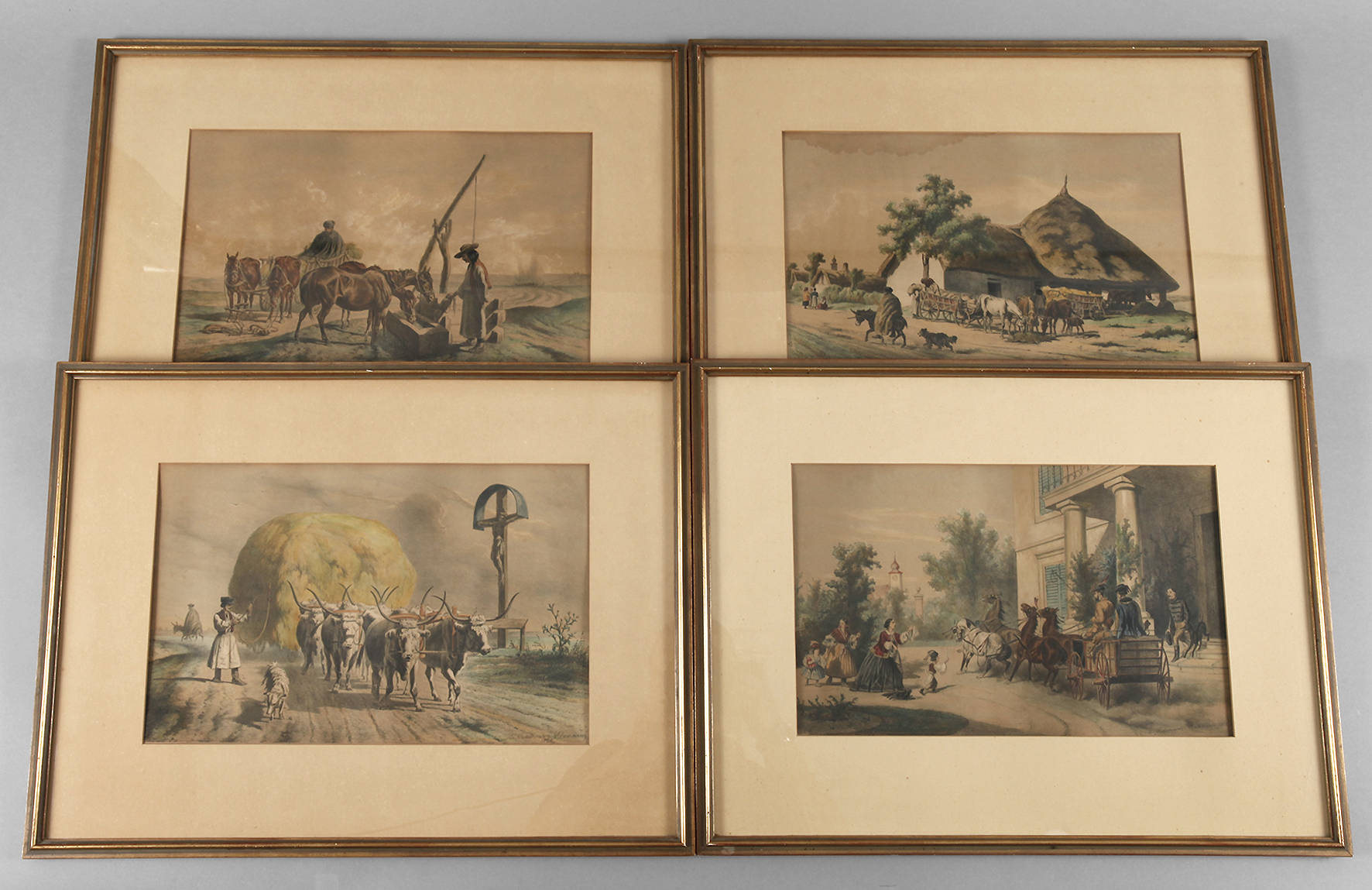 in der Platte signiert, datiert 1961, handcoloriert, alle im Passepartout unter Glas in einfachen profilierten Leisten gerahmt, gegilbt, eins wasserfleckig, Blattausschnitt je 24 x 37 cm.