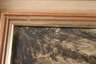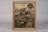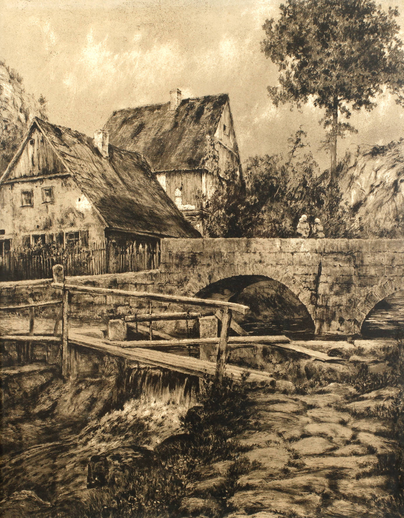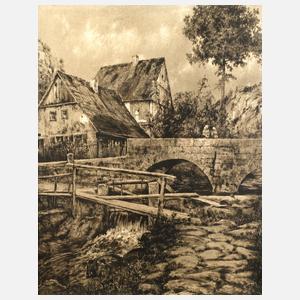 Darstellung zweier, auf einer Steinbrücke über gurgelndem Flüsschen vorm Bauernhaus sitzender und schwatzender Mädchen, Lithografie, rechts undeutlich signiert ”H. Menke” ?, hinter Glas in gekehlter Leiste gerahmt, IM 63 x 50 cm.