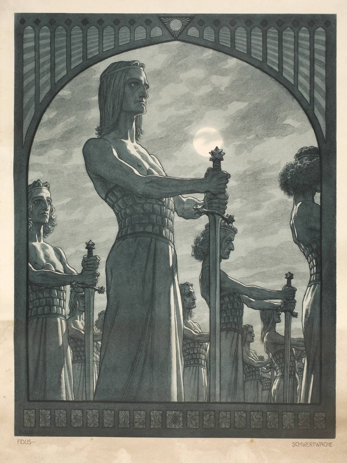 junge Recken mit zu Boden gerichteten Schwertern im Mondenschein, symbolistische Farblitho in Graublau, Entwurf von 1895, in der Platte signiert, gerollt, reinigungsbedürftig, etwas fleckig, in der originalen Versandrolle von Fidus ”Verlag des St. Georgs-Bundes Woltersdorf bei Erkner-Berlin”, Blattmaß ca. 41,5 x 55 cm. Künstlerinfo: eigentlich Hugo Reinhold Karl Johann Höppener, dt. Maler, Zeichner, Illustrator, Architekt und Buchschmuckkünstler (1868 Lübeck bis 1948 Woltersdorf), Schüler der Lübecker Gewerbeschule, studierte 1887 kurzzeitig an der Akademie München, anschließend Schüler und Jünger des Malers und Naturapostels Karl Wilhelm Diefenbach (1851-1913) in Höllriegelskreuth, nannte sich in Verehrung seines Lehrers ”Fidus (dt.: Der Getreue)”, zählte um 1900 zu den berühmtesten Künstlern Deutschlands und zu den ”Vätern des dt. Jugendstil”, unter anderem Mitarbeiter der Münchner Zeitschriften ”Jugend” und ”Simplicissimus” sowie der Berliner Zeitschrift ”Pan”, 1943 Ernennung zum Professor h.c., tätig in Berlin, München, Monte Verita und Woltersdorf-Schönblick, Quelle: Thieme-Becker, Vollmer, Dressler, Matrikel der Münchner Akademie, Wikipedia und Internet.