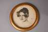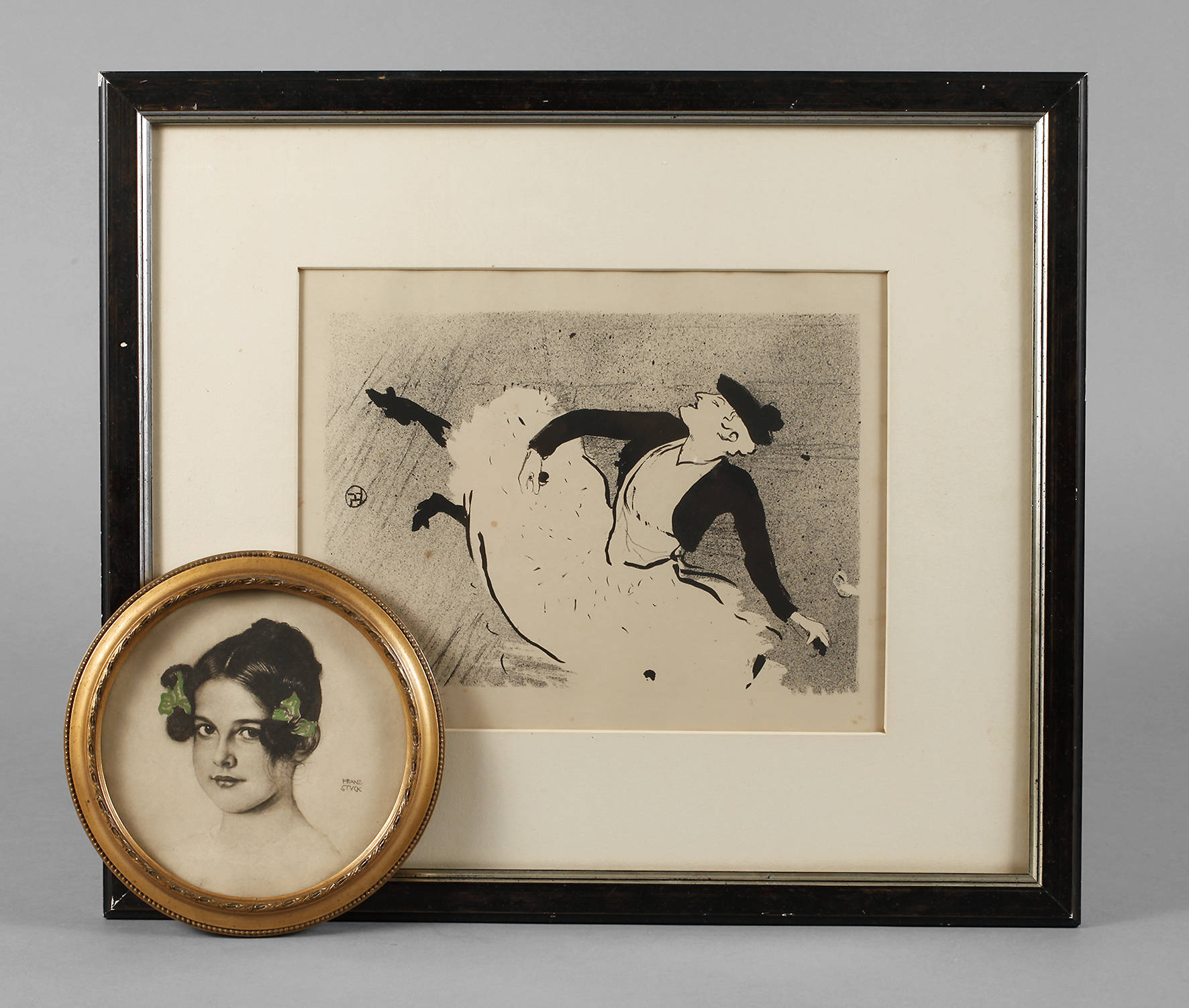 Henri de Toulouse-Lautrec, Tänzer im Damenkleid, in der Platte monogrammiert, im Passepartout unter Glas gerahmt, etwas stockfleckig, Blattausschnitt 23 x 29,5 cm, dazu Prof. Franz von Stuck ”Bildnis der Stieftochter Olga Lindpaintner”, unter Glas in runder goldener Goldstuckleiste gerahmt, diese minimal restaurierungsbedürftig, D 19 cm.