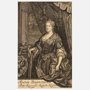 Darstellung der russischen Zarin Anna Iwanowna (1693–1740) mit Zepter und Krone im Krönungsornat im Palastinterieur, Kupferstich, unten betitelt ”Anna Iwanowna Jetzt Regierende Rußische Kaiserin”, rechts unten signiert ”Mentzel sc. Lips.” und rechts datiert 1733, Blatt auf die Darstellung beschnitten, minimal fleckig und gegilbt, ungerahmt, Blattmaß ca. 32,5 x 20,5 cm. Künstlerinfo: auch Menzel, dt. Kupferstecher und Illustrator (1677 Leipzig bis 1743 Leipzig), Schüler von Erasmus Andresohn, tätig in Leipzig, Quelle: Thieme-Becker und Wikipedia.