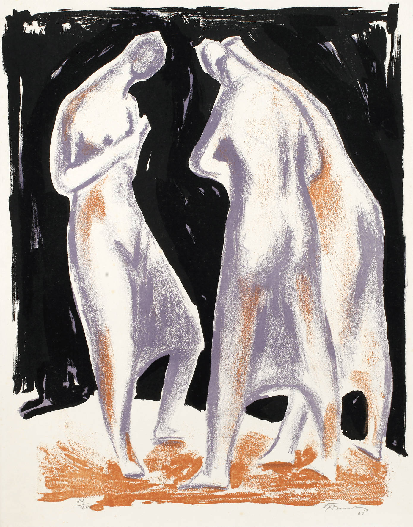 drei abstrahierte Figuren in Kreisformation mit gesenkten Häuptern vor dunklem Fond, Farbholzschnitt, rechts unten signiert ”Oldenburg” und datiert (19)”61”, links Auflagenangabe ”82/200”, rückseitig in Blei annotiert, lichtrandig, ungerahmt, Maße 49 x 39 cm. Künstlerinfo: deutscher Maler und Bildhauer des Expressionismus (1914 Danzig - 1992 Unna), 1928 als Schüler von Fritz August Pfühle an der Technischen Hochschule in Danzig, 1936 Studium der Architektur in Berlin, zahlreiche Ausstellungen im In- und Ausland, Quelle: Internet.