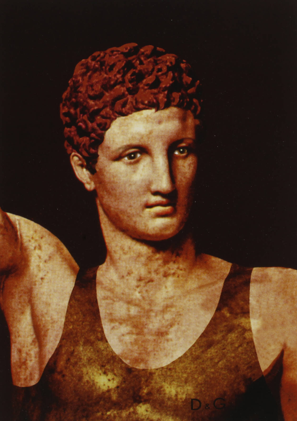 typischer Farboffsetdruck der Künstlerin, der die antike Figur des Hermes in einem Muskelshirt des Modelabels Dolce & Gabbana zeigt, rechts unten signiert ”O. Tobreluts” und datiert (19)”99”, rückseitig Annotationen von fremder Hand, ungerahmt, Maße 60 x 50 cm. Künstlerinfo: russische Gegenwartskünstlerin, geboren 1970 in Leningrad, 1986-89 Architekturstudium an der staatl. Universität Leningrad, 1989 absolvierte sie einen Kurs zu Computergrafik am Institut ART+COM in Berlin, Teilnahme an zahlreichen nationalen und internationalen Einzel- und Gruppenausstellungen, lebt und arbeitet in St Petersburg, Quelle. Internet.