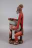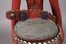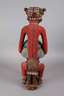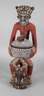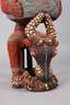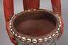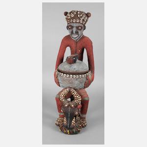 Kameruner Grasland, 20. Jh., hartes Tropenholz und Leder, auf Hocker sitzende weibliche Figur über Gnuschädel, in den Händen eine Schüssel tragend, diese mit abnehmbarem Deckel, Knauf in Form eines Reptils, alles mit farbigen Perlen und Kaurischnecken besetzt, unbeschädigte gute Erhaltung, H 80 cm.