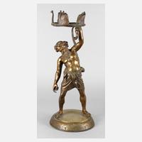 Ende 19. Jh., auf der Plinthe sign. Duchemin, Bronze bräunlich patiniert, verkleinerte Nachbildung des Originals aus der Casa dei marmi (Pompeji), welches sich im Besitz des Museo Nazionale Archeologico in Neapel befindet, vollplastische Darstellung des trunkenen Bacchus, lediglich mit einem Tuch um die Hüfte bekleidet, hier mit mittig gelochter Metallplatte, diese wurde wohl als Lampenfassung genutzt, auf runder, am Rand ornamental ziselierter Plinthe, in Form einer umgedrehten Trinkschale montiert, Altersspuren, H 60 cm.