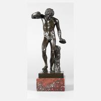 Ende 19. Jh., auf der Plinthe bez. Museé de Florence, Bronze dunkelbraun patiniert, verkleinerter Nachguss der antiken Skulptur aus der Galerie Degli Uffizi, aus dem 2. oder späten 3. Jahrhundert v. Chr., Darstellung eines musizierenden Fauns mit athletischem Körperbau, den rechten Fuß erhöht abgestellt, lediglich mit einem Eichenblatt bekleidet, in der linken Hand eine Schelle haltend, die der rechten Hand fehlt, auf quadratischer Plinthe, H inkl. Plinthe 30 cm, H gesamt 35 cm. Quelle: Internet.