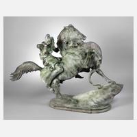 Eisenguss grünlich patiniert, naturalistische Darstellung einer halbnackten Amazone zu Pferde, auf ovaler Plinthe mit Felsen, die Frau nur bekleidet mit Rock und Haube, das Pferd sich aufbäumend und am Hals von einem Tiger angefallen, die Raubkatze mit punzierten Fellstreifen, Altersspuren und Risse, zwei Beine und der Schweif geklebt, Arm der Reiterin fehlt, H 69 cm, L 90 cm.