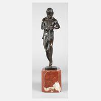 um 1910, signiert mit Zusatz FB, Bronze dunkel patiniert, tanzender Faun im Lendenschurz, auf einer doppelläufigen Flöte musizierend, auf einen roten, weiß durchzogenen Marmorsockel montiert, altersgemäße gute Erhaltung, H Figur 28 cm, H zusammen 38 cm.