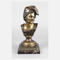 2. H. 19. Jh., rückseitig bezeichnet F. Barbedienne Fondeur, Bronze dunkel patiniert, Darstellung einer Frau im Stil der Schule von Fontainebleau, mit Diadem und aufwendig geflochtener Frisur, sinnend zur Seite blickend, Büste auf getrepptem Rundsockel, auf einen runden Marmorsockel montiert, zwei minimale Kratzer, H Bronze 15 cm, H gesamt 18 cm. Künsterinfo: frz. Metallbauer und bekannter Bronzegießer, (1810 bis 1892), Quelle: Internet.