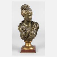 2. Hälfte 19. Jh., rs. sign. A. Carrier, Bronze grünlich-braun patiniert und partiell vergoldet, Bruststück einer jungen Schönheit, um ihre linke Schulter ein Tuch drapiert und die rechte Brust entblößt, das kunstvoll zusammengebundene Haar und das Dekolleté mit Rosensträußchen verziert, auf Sockel, auf flachen, quadratischen roten Marmorsockel montiert, dieser winzigst bestoßen, H gesamt 32 cm. Künstlerinfo: frz. Bildhauer (1824 bis 1887), Quelle: Internet.