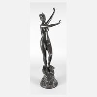 um 1920, signiert Arthur Schulz, gestempelt Aktiengesellschaft Gladenbeck Friedrichshagen, Bronze zweifarbig patiniert, stehende nackte Schönheit mit Blumenkranz, die Arme ausgebreitet, ein Tuch hinter dem Rücken ausbreitend, die Augen geschlossen, auf runder, naturalistisch gestalteter Plinthe mit floralen Elementen, gute Erhaltung mit wenigen Altersspuren, H 63 cm. Künstlerinfo: (1873 bis 1943) studierte einige Semester Architektur an der Technischen Hochschule Charlottenburg und wechselte dann ins Bildhauerfach, 1893 bis 1897 studierte er an der Berliner Akademie für Bildende Künste bei Gerhard Janensch, nach seiner künstlerischen Ausbildung blieb er in Berlin ansässig, neben Denkmälern, Büsten und Kleinplastiken gehörte auch Bauplastik, hier insbesondere Reliefs, zu seinem Schaffen, über seinen Lebensweg nach dem Ersten Weltkrieg ist nichts überliefert, im Jahr 1900 gab Artur Schulz in Berlin das dreibändige Mappenwerk Deutsche Sculpturen der Neuzeit heraus, Quelle: Thieme/Becker, Wikipedia.
