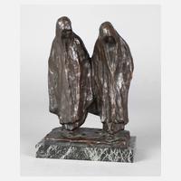 1920er Jahre, unleserlich signiert Lars Ado?, Bronze, braun patiniert, zwei in lange fließende Umhänge gekleidete Gestalten, wohl Orientalinnen, auf rechteckiger Plinthe, diese auf flachen, schwarz und grün-grau geäderten Marmorsockel montiert, gute Erhaltung, H 22 cm.