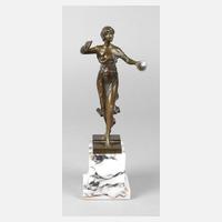 um 1900, unsign., Zinkspritzguss braun-grünlich und partiell schwarz-grünlich patiniert, grazil anmutende junge Frau in tanzender Pose, den rechten Arm ekstatisch weit von sich gestreckt, den linken an ihr Haupt gelegt, den Oberkörper entblößt und lediglich mit einem weich fallenden langen Rock bekleidet, auf flacher runder, mit einer Rose verzierten, fein strukturierten Plinthe, auf runden Steinsockel montiert, dieser minimal bestoßen, H Plastik 24 cm, H gesamt 28,8 cm.