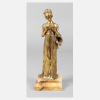 um 1900, Bronze, Patina verputzt, geritzter Namenszug am Sockel seitlich, am Saum des Kleides eingeschlagen ”LX 72”, elegante Dame im Empirekleid, stehend, in ein Buch versunken, am linken Arm den Hut eingehängt, auf sandfarbenem Marmorsockel montiert, dieser mit Abschlägen, Bronze teilweise mit leichten Oberflächenrissen, H Bronze 27,5 cm, H gesamt 31 cm. Künstlerinfo: (1856 Gent bis 1928 ebenda), war 1882 bis 1928 in Paris tätig, Quelle: Internet.