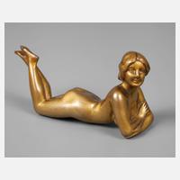 um 1900, Bronze golden patiniert, liegender erotischer Akt einer Jugendstilfrau, sich auf den Ellenbogen aufstützend, die Arme verschränkt und die Beine in der Luft, gute Erhaltung, L 9,5 cm.