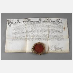 ”Wir Leopold von Gottes Gnaden Erwolter Römischer Kaiser zu allen Zeitten Mehrer des Reichs in Germanien, zu Hungarn, Böheimb, Dalmatien, Croatien und Sclavonien ...”, Tusche auf Pergament, im Text datiert 1. Juli 1681, gezeichnet ”Leopold”, ”(Vidit) Leopold Wilhelm Graff zu Königsegg (Reichsvizekanzler)” sowie ”Ad mandatum sac. Caes. Maiestatis proprium Johann Ambroß Högell”, mit großer, an schwarz-gelber Kordel angehängter Massekapsel mit Wachssiegel-Abdruck des Kaisersiegels Leopold I. (1658-1705), Siegel angestaubt, Kapsel am Rand bestoßen, Pergament etwas fleckig und gefaltet, Maße 44 x 73 cm, D Kapsel 14 cm.