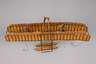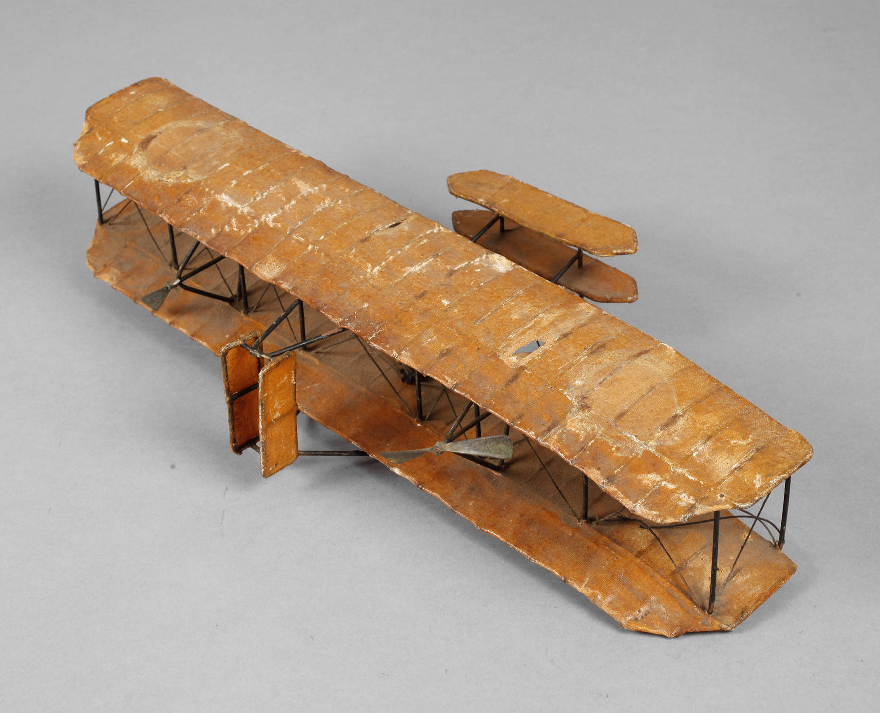 Eigenbau, Anfang 20. Jh., Drahtgestell mit lackierter Leinenbespannung und Zwirn, Nachbau des Wright Flyers, dem ersten von den Brüdern Wright hergestellten Doppeldecker-Motorflugzeug (Flug am 17.12.1903, heute im National Air and Space Museum ausgestellt), detailreiches Modell mit angedeutetem Motor und zwei starren Propellern, Alters- und Gebrauchsspuren, nicht ganz komplett, Tuch etwas löchrig, H 8 x B 40 x T 19 cm.