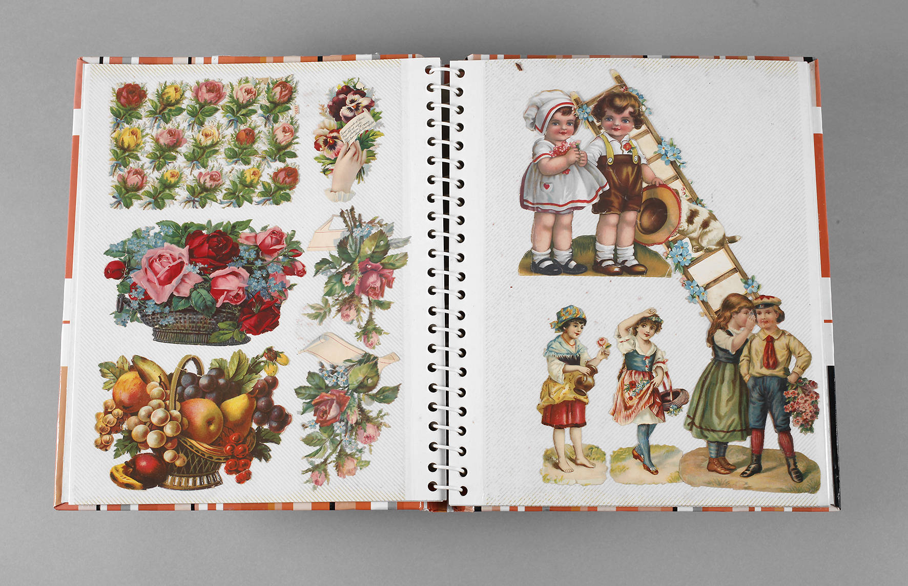 um 1900, ca. 300 Oblaten, geprägt, gestanzt und farbig lithogr., vorw. Kinder- und Blumenmotive, darunter wenige Szenen, vorw. als Bogenstücke, Stege teils mit Herstellerangabe (M. & S., SB, LB), in neuzeitlichem Selbstklebealbum, vorw. gute Erhaltung, L 3 bis 24 cm.