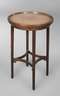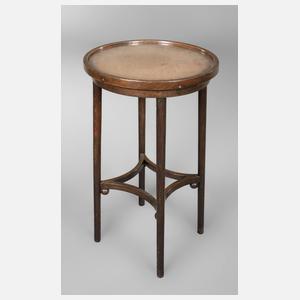 um 1905, Platte mit Klebeetikett Thonet Wien, Buchenbugholz, braun gebeizt, schlankes Tischchen mit vierpassiger geschwungener Verstrebung und Kugelabschlüssen, eingesetzte Glasplatte, Oberfläche rest.bed., H 71 cm, D 45 cm.