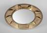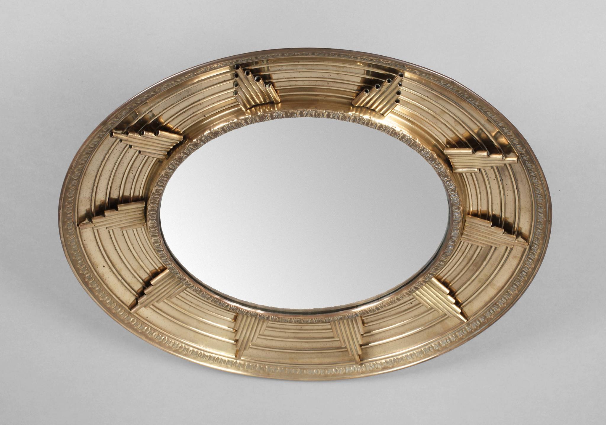 Messigblech geprägt um 1925, runder Wandspiegel mit Strahlenmotiv aus verlöteten Messingstäben, D 46 cm.