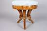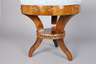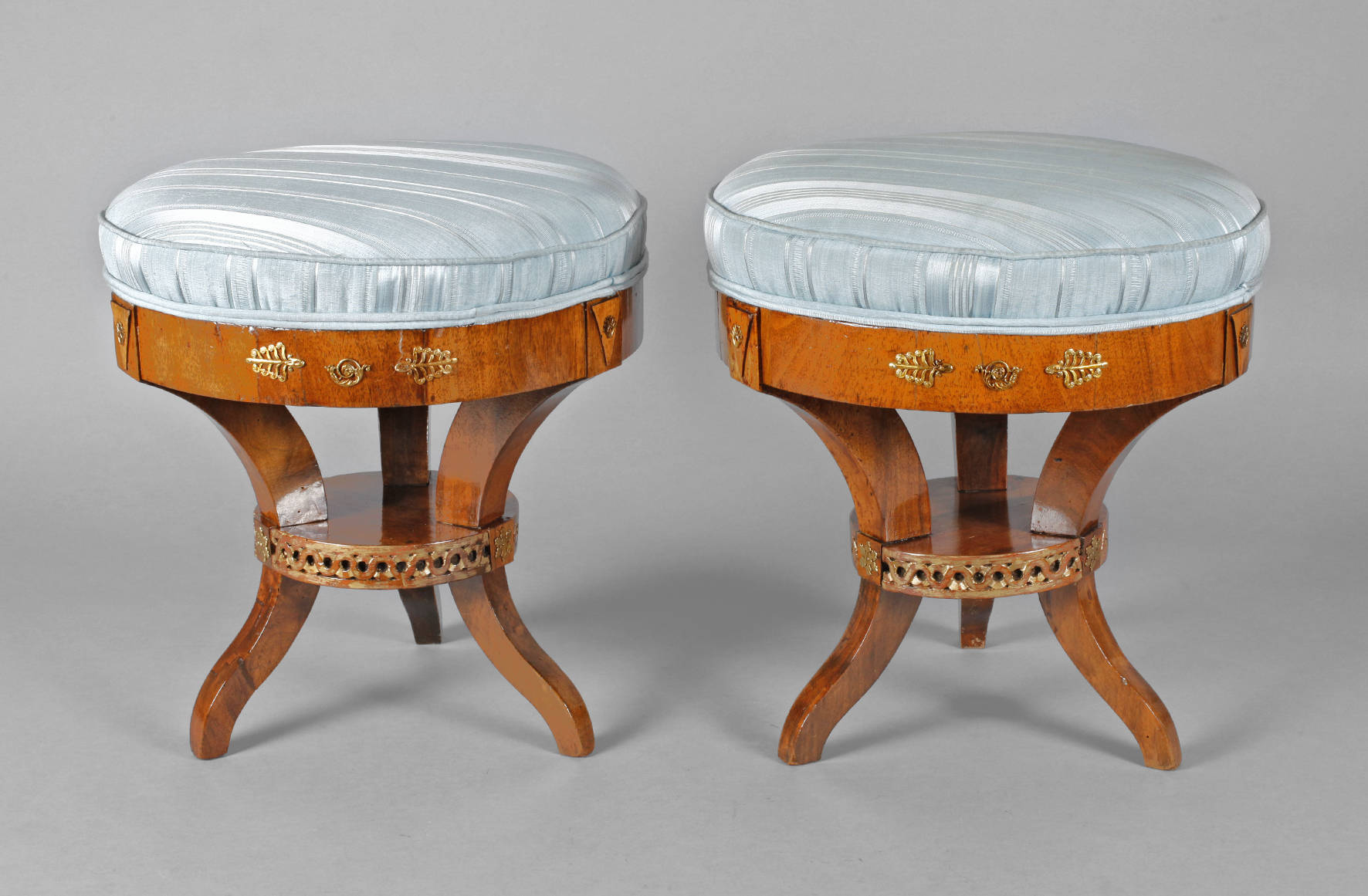 um 1800, Nussbaum furniert, runde Zarge verziert mit klassizistischen Messingapplikationen, dreibeiniges Gestell mit geschnitztem und vergoldetem Mäanderband, restauriert, hellblauer Seidenbezug erneuert, H 41 cm, D 40 cm.