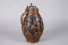 um 1800, Sinterbrand mit manganfarbener Salzglasur, geritzter und punzierter Reliefdekor mit floralen Auflagen, originaler übergreifender Zinndeckel, ungepunzt, später mit Draht umflochten (alt repariert), an der Mündung ein größerer Ausbruch, H 35 cm.
