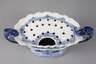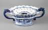 wohl Frankfurt, 18. Jh., cremefarbener Scherben, weißlich glasiert und fein mit kobaltblauer Scharffeuerfarbe bemalt, muschelartiges Gefäß mit Blüten und Vogelmotiv, die Oberseite mit einer Blütenranke verziert, seitlich eingerollte Henkel mit stilisierten Tierköpfen, Gebrauchsspuren mit Kratzern und kleinen Glasurfehlstellen, sonst jedoch unbeschädigt, L 36 cm.