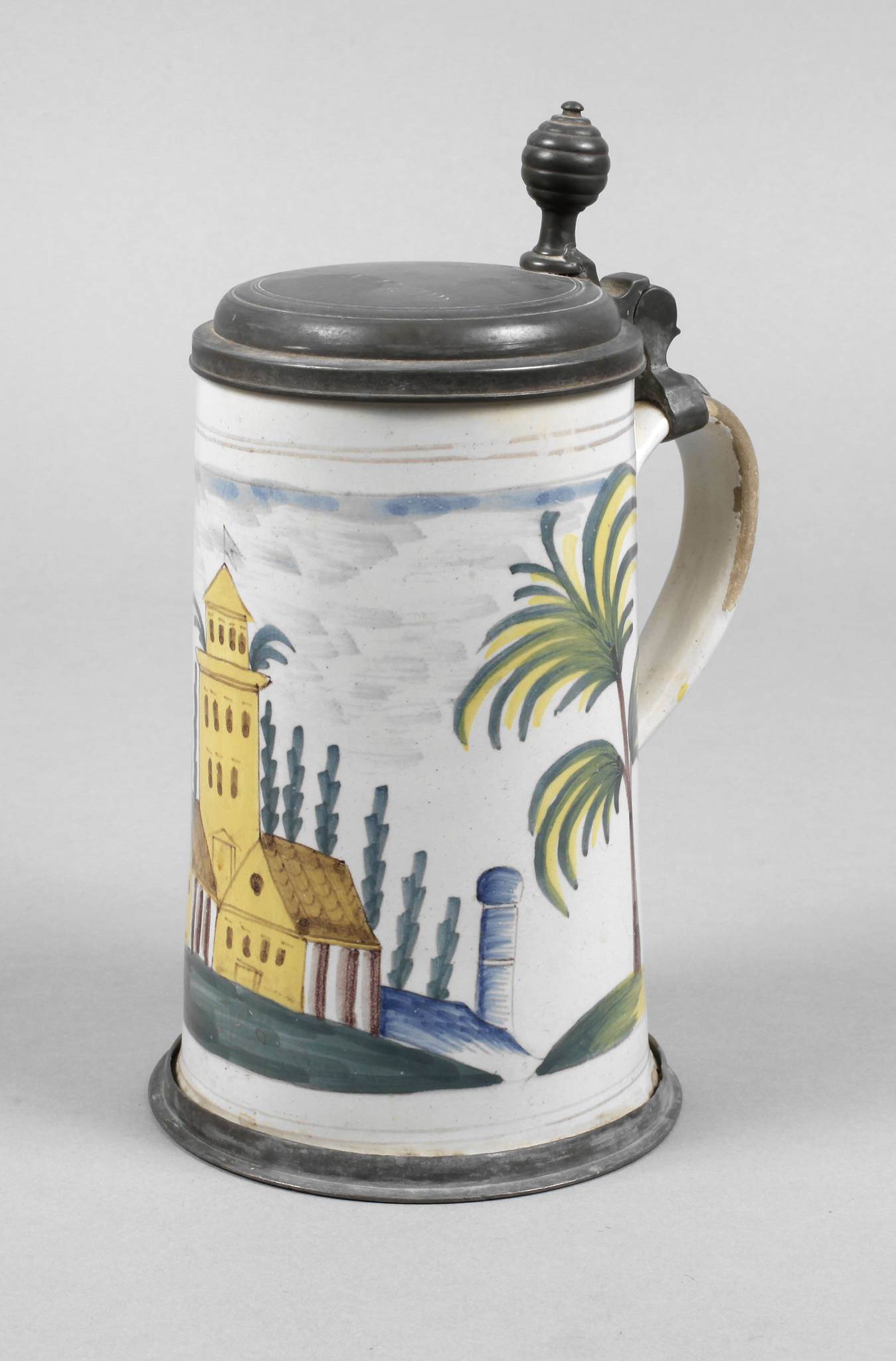 um 1780, leicht konische Form, rötlicher Fayencescherben, mit Scharffeuerfarben bemalt, auf hellem Fond, Darstellung von Gebäuden in Landschaft, seitlich Baummotive, Zinnstandring, originaler Deckel mit kleinem Kugeldrücker, graviert A.M.G.W., unter dem Zinnstandring sichtbare Glasurfehlstellen und ein Ausbruch sowie ein Haarriss in der Wandung, Glasurfehlstellen am Lippenrand und Henkel, H 24 cm.