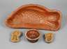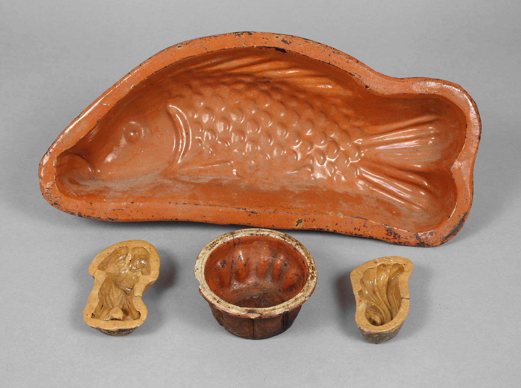 wohl Hessen, 19. Jh., Irdenware, innen glasiert, Fisch, Gugelhupfform, ein Engel und eine Muschel, zwei Teile brandrissig, eins haarrissig, Gebrauchsspuren, L max. 42 cm.