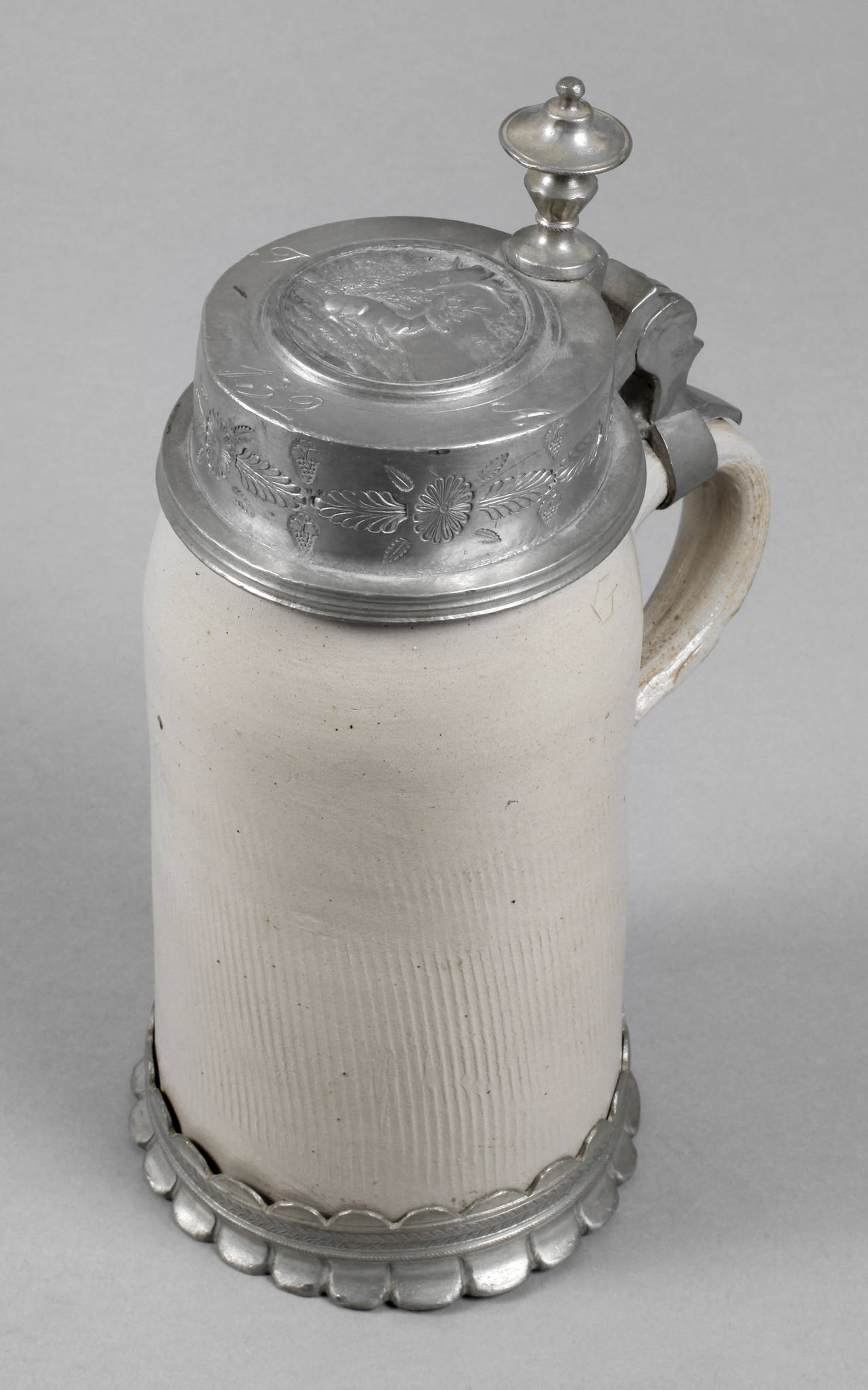 2. Hälfte 19. Jh., graues Steinzeug salzglasiert, die Wandung gekämmt, Zinnstandring mit umlaufendem floralen Band, der Deckel mit liegendem Hirsch in Landschaft, Besitzermonogramm JA mit Nummer 132, gute Erhaltung, H 25 cm.