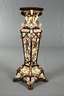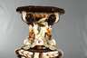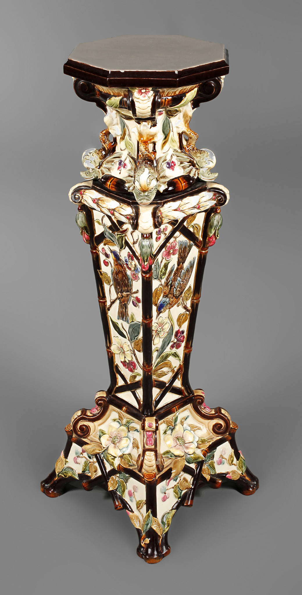 um 1900, ungemarkt, japonisierender Dekor, mit Bambusstäben und Vögeln zwischen Zweigen und Früchten, polychrome Unterglasurbemalung, dreiteilig verschraubter Korpus, die Nase eines Delfins geklebt, sonst nur einige kleine Chips, H 104 x B 39 x T 39 cm.