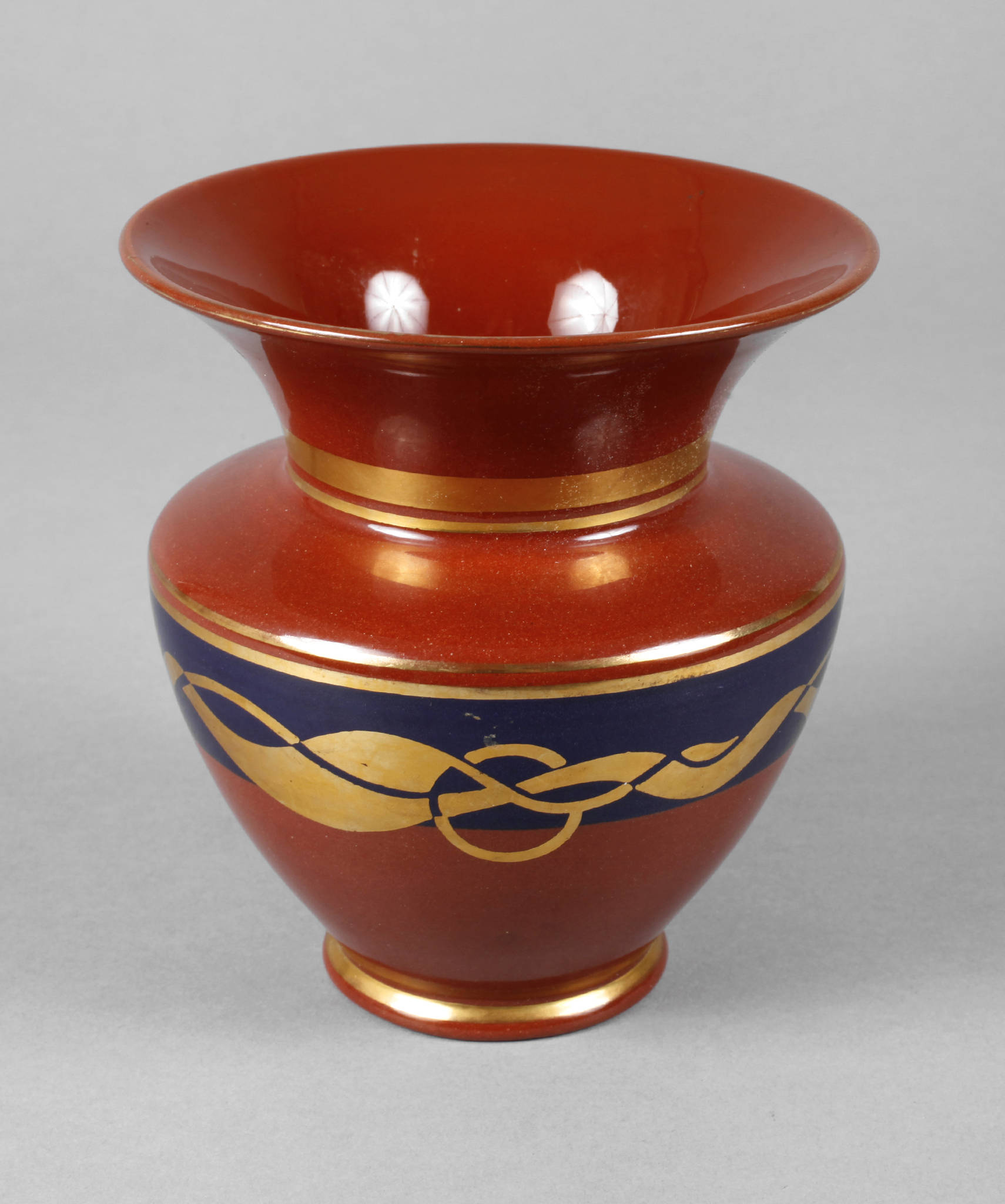 um 1920, Prägemarke, Schriftzug Handmalerei, Modellnummer 551, rotbrauner Scherben kobaltblau bemalt, klar glasiert und vergoldet, verziert mit umlaufenden Bandmotiven, gute Erhaltung, H 15 cm.