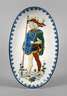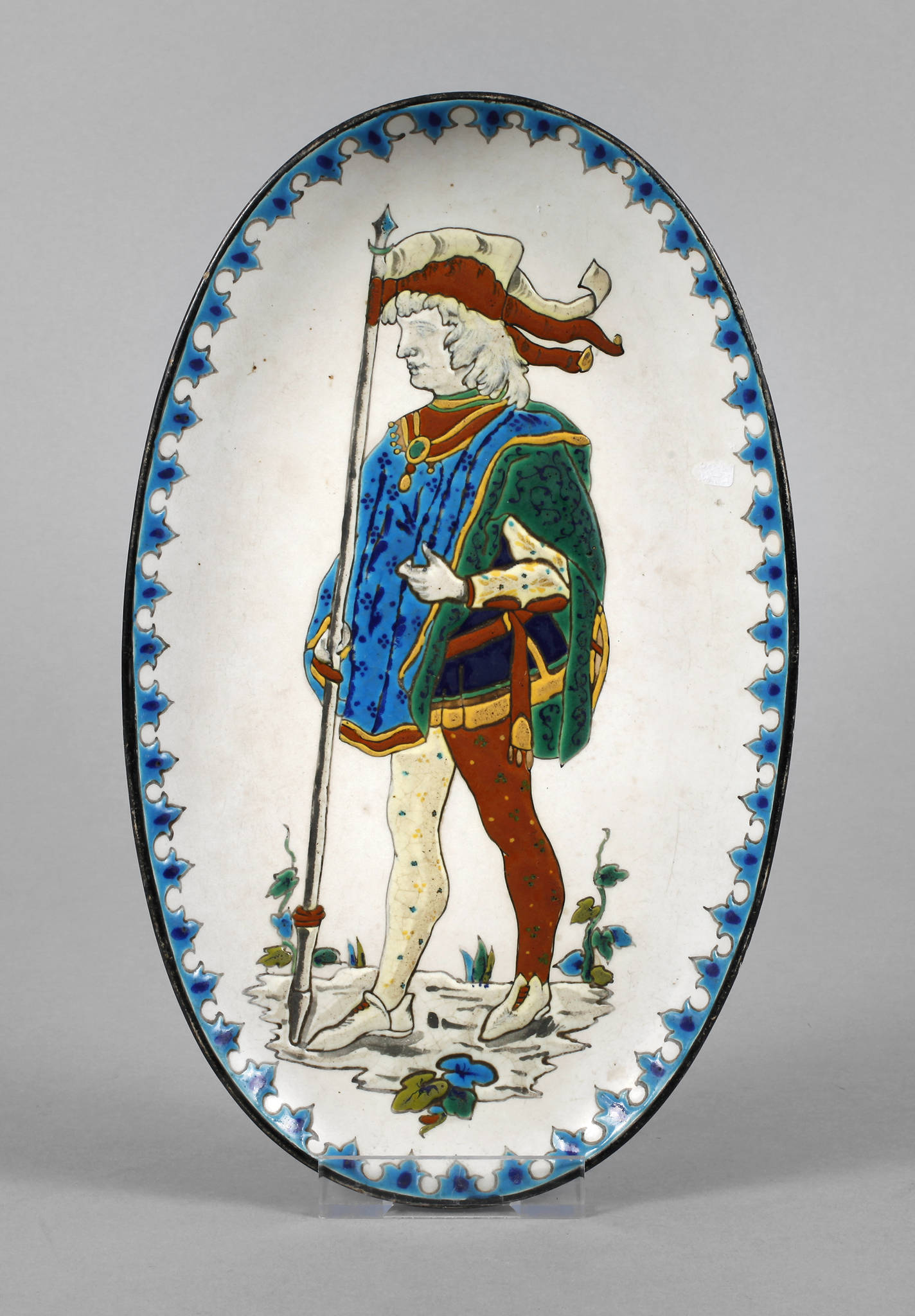 1930er Jahre, gestempelt France Groisy le roi, Majolika mit farbigem Pinseldekor, Ritter mit Lanze, auf einer ovalen Schale mit ornamental gestaltetem Rand, Altersspuren, L 31 cm.