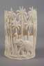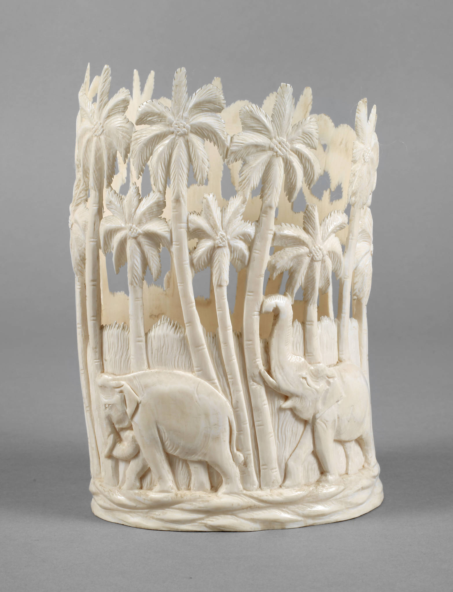 Anfang 20. Jh., aus einem massivem Zahn geschnitztes filigranes Zierobjekt, teils graviert, ovalzylindrische Form mit durchbrochen gearbeitetem Palmenhain, umlaufend im Hochrelief gearbeitete Elefanten, eingesetzte Bodenplatte fehlt, kleinere Fehlstelle, sonst gute Erhaltung, H 18 cm.