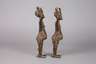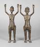wohl aus Gebieten der Akan, 20. Jh., Gelbguss, aus der verlorenen Form, zwei stehende leicht abstrahiert gearbeitete Gestalten mit erhobenen Armen, Körperschmuck und verzierter Oberfläche, H je 35 cm.