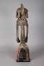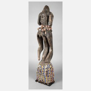 Gruppe der Akan (Ebrie oder Alangoa), Hartholz geschnitzt, komplett krustiert, weibliche Figur in abstrahierter Formensprache, Haupt mit Zopfringen und Haarkamm, Halsschmuck aus gefädelten Stein- und Glasringen sowie handgefertigten Messingschellen, untere Körperhälfte verdeckt von gemustertem Glasperlenrock (mit Fehlstellen), Holz mit Trocknungsrissen, wohl älteres Stück, H 105 cm.