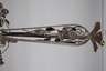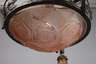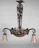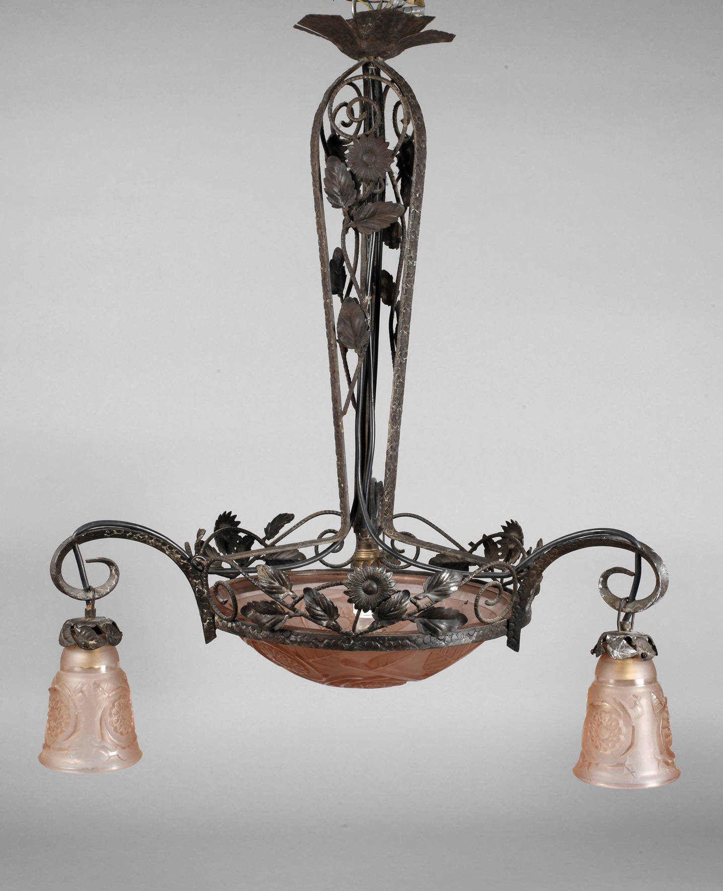 um 1920, Gestell aus geschwärztem Schmiedeeisen, durchbrochen gearbeitetes Gestänge mit plastisch gearbeiteten Blütenranken, abgehängter Ring mit drei kurzen, eingerollten Leuchterarmen, abgehängte Glockenschirme aus satiniertem, formgeblasenen roséfarbenem Glas, vierflammig elektr., Altersspuren, H ca. 90 cm, D ca. 70 cm.