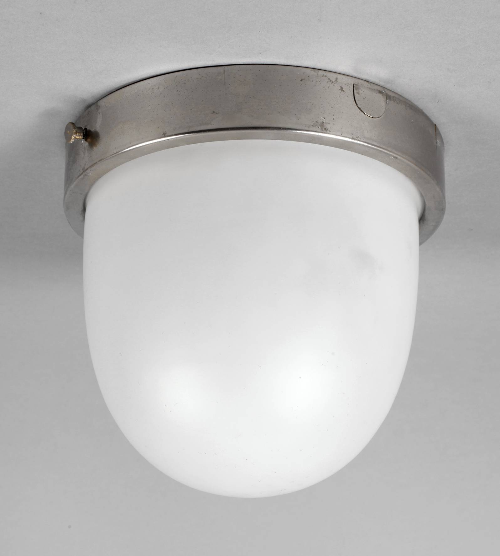 Entwurf Marianne Brandt und Hin Bredendieck um 1929, auf Schirm gestempelt Nr. 474 a m, Ausführung Körting & Mathiesen, Leipzig. opakweißes Glas farblos überfangen, seidenmatt geätzt, vernickelte zylindrische Fassung aus Messingblech, Metallhalterung und Reflektorscheibe, D 18 cm. Quelle: Bauhausleuchten? Kandemlicht, S. 108.