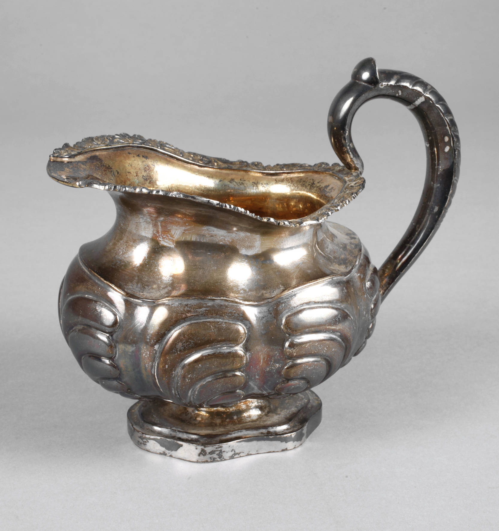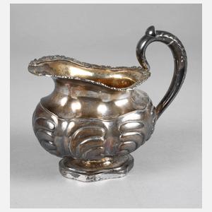 Leningrad 1838, Stadtmarke, Silberstempel 84 Zolotniky, Meisterpunze I.K. im Rechteck, Beschaumeister in kyrillisch DT, Kännchen innen mit Resten alter Vergoldung, die Wandung, Henkel und der Ausguss floral reliefiert, L 17 cm, G ca. 302 g.