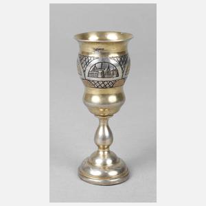 2. Hälfte 19. Jh., Silber vergoldet, gestempelt 84 Zolotniki, graviert und geschwärzt, unleserliche Meistermarken und Beschaustempel, auf der Kuppa Architekturdarstellungen, am Stand etwas gedellt, sonst normale Altersspuren, H 10 cm, G ca. 43,7 g.