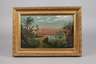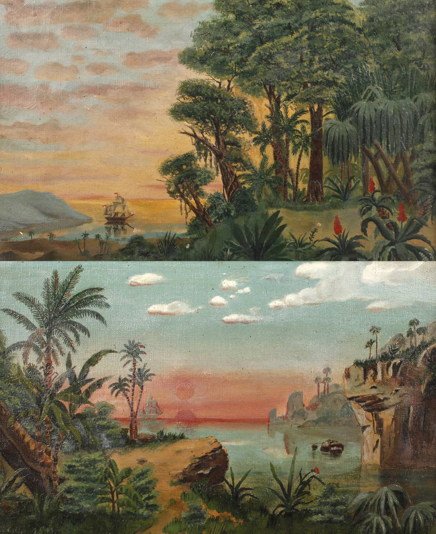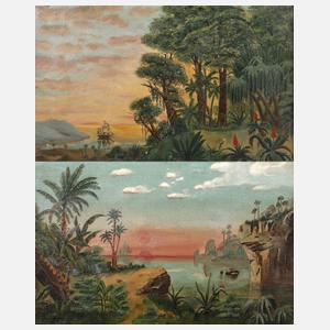 Uferdarstellung mit tropischer Vegetation und Schiffen auf See, Malerei in warmer Farbigkeit, Öl auf Leinwand, eine Arbeit unten links datiert und signiert „Weisse 19.8.(18)95”, minimal restaurierungsbedürftig, gerahmt, Falzmaß ca. 23 x 36 cm.