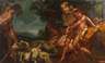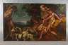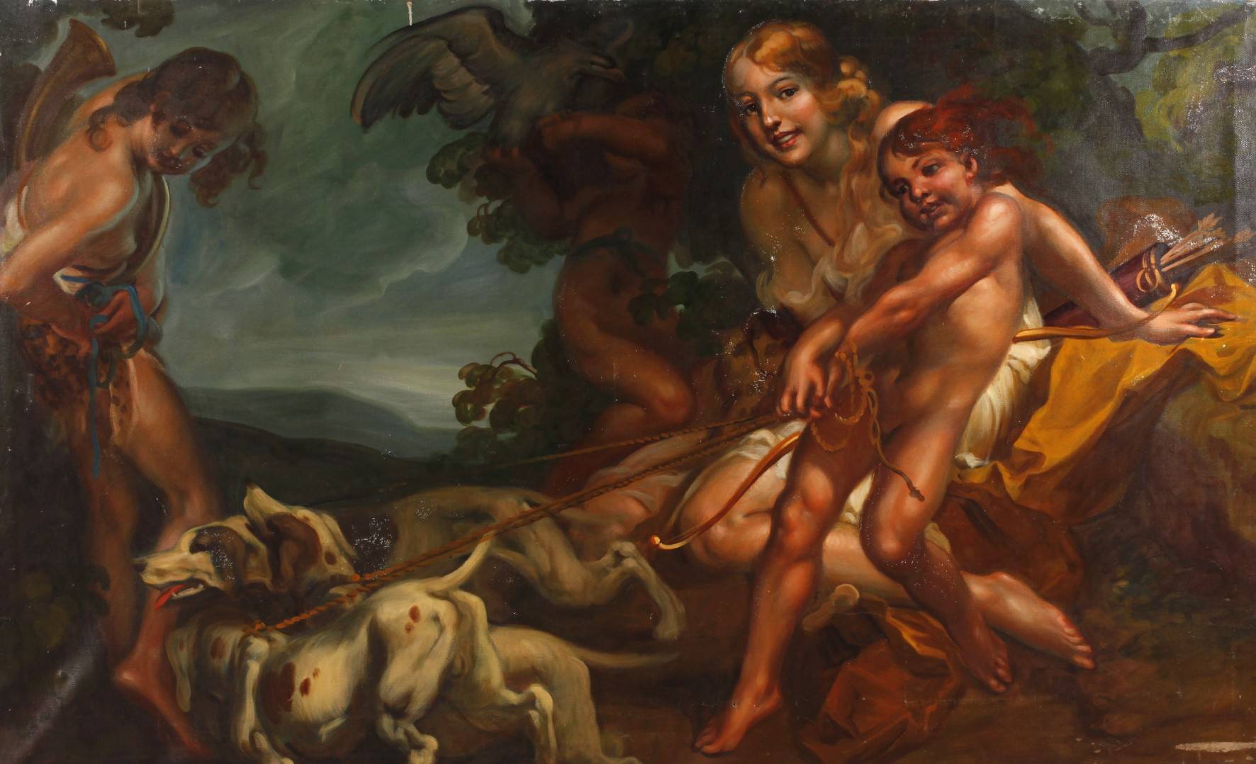 wohl Darstellung der jugendlichen, römischen Göttin der Jagd Diana mit Hunden und ihren kindlichen Begleiterinnen in sommerlicher Landschaft, dekorative, lasierende Malerei in fein abgestimmter, kraftvoller Farbigkeit, Öl auf Leinwand und Keilrahmen, 20. Jh., unsigniert, kleinere Fehlstellen in der Leinwand, Farbplatzer, restaurierungsbedürftig, ungerahmt, Maße 110,5 x 184,5 cm.