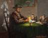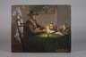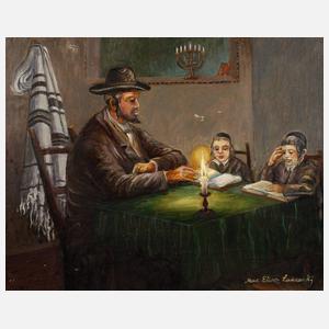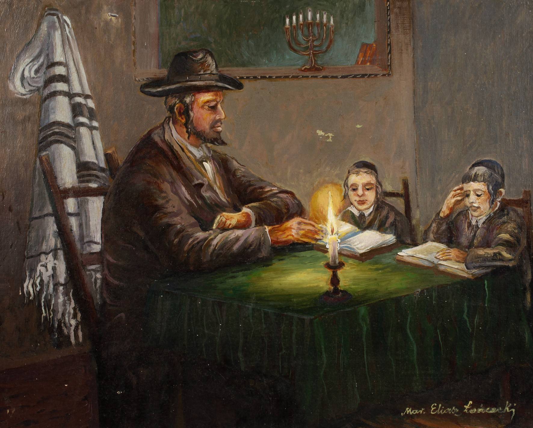 jüdischer Gelehrter im Interieur zwei Knaben lehrend, im Hintergrund Menoraleuchter, Öl auf Leinwand 20. Jh., unten rechts teils unleserlich signiert „Mar. Eliasz L...“, auf Keilrahmenrückseite unleserlich bezeichnet, partiell Abplatzer in der Malschicht, restaurierungsbedürftig, ungerahmt, Maße ca. 40 x 50 cm.