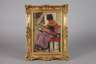 idyllischer, sommerlicher Winkel auf dem Hühnerhof mit älterer, auf einem Stuhl im Sonnenlicht sitzender Frau in einem Buch lesend, pastose Genremalerei mit breitem Pinselduktus, Öl auf Leinwand und Karton 1. Hälfte 20. Jh., rechts unten undeutlich signiert ”... Frank”, im Goldstuckrahmen gerahmt, Falzmaß 31 x 22 cm.