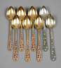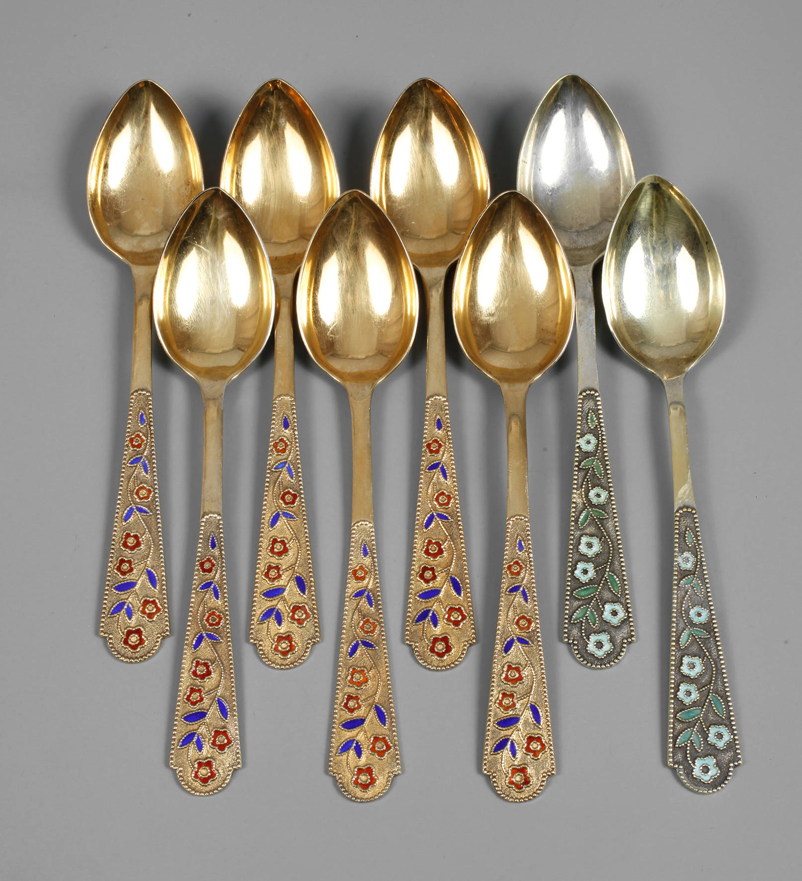 2. Hälfte 20. Jh., gestempelt Hammer und Sichel im Stern 875, vergoldet mit bunt emaillierten Blütenmotiven, leichte Gebrauchsspuren, L 14,5 cm. G zusammen ca. 178 g.
