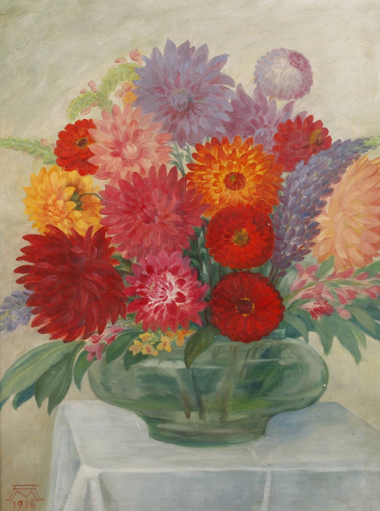 prächtiges, farbenfrohes Arrangement mit Dahlien und Lupinen in Glasvase, Öl auf Pappe, links unten ligiert monogrammiert und datiert „AM 1936“ (vergleiche Monogrammlexikon Goldstein), rückseitig auf Rahmen Stempel „Bilder-König Alexanderstr. 10 Darmstadt“, Malschicht mit kleinen Verlusten, in profilierter Leiste gerahmt, diese mit Altersspuren, Falzmaß ca. 61 x 47,5 cm. Künstlerinfo: Künstlername Albinmüller, dt. Entwerfer, Architekt und Maler (1871 Dittersbach / Erzgebirge bis 1941 Darmstadt), 1884-87 Tischlerlehre, Besuch der Kunstgewerbeschule Mainz, ab 1900 Lehrer an der Kunstgewerbe und Handwerksschule Magdeburg, 1903 Übernahme der Klasse für Metallgestaltung und Innenraum, 1904 auf Weltausstellung in St. Louis Grand Prix für ein Herrenzimmer, autodidaktische Ausbildung zum Architekten, 1909 Berufung an die Darmstädter Künstlerkolonie, 1907 Ernennung zum Professor, 1907-11 Lehrer für Raumkunst am Großherzoglichen Lehratelier für angewandte Kunst, 1926 Ernennung zum Architekten der Deutsche Theaterausstellung 1927 in Magdeburg, ab 1934 Hinwendung zur Landschaftsmalerei, Quelle: Thieme-Becker, Dressler, Monogrammlexikon Goldstein und Wikipedia.