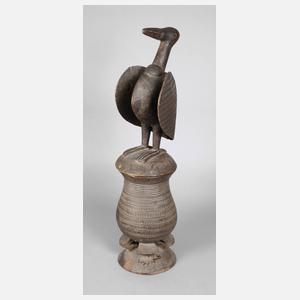 Nigeria, 20. Jh., tropisches Hartholz, wohl Bockholz, birnenförmiger Korpus auf vierfüßigem Sockel und umlaufend mit Kerbschnitzerei verziert, gewölbter Deckel mit aufsitzendem, wachendem Vogel, Flügel dessen ebenfalls mit Kerbschnitzerei gestaltet, Schnabel geklebt, Altersspuren, H 75 cm, D max. ca. 20 cm.