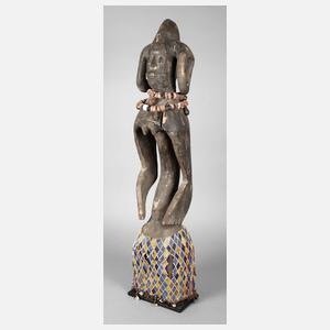 Gruppe der Akan (Ebrie oder Alangoa), Hartholz geschnitzt, komplett krustiert, weibliche Figur in abstrahierter Formensprache, Haupt mit Zopfringen und Haarkamm, Halsschmuck aus gefädelten Stein- und Glasringen sowie handgefertigten Messingschellen, untere Körperhälfte in Gestalt eines Webrollenhalters, diese verdeckt von gemustertem Glasperlenrock (mit Fehlstellen), Holz mit Trocknungsrissen, wohl älteres Stück, H 105 cm.