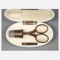 Ende 19. Jh., ovale Dose aus massivem Elfenbein mit Messingmontierung, inneliegend Schere und Fingerhut aus ziseliertem Messingblech, Druckknopf fehlt, L 8 cm.
