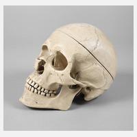 Mitte 20. Jh., Modell eines menschlichen Schädels, Masse cremefarben gefasst und umlaufend nummeriert, Kiefer mit Federmechanismus arretiert, Altersspuren, H 23 cm.